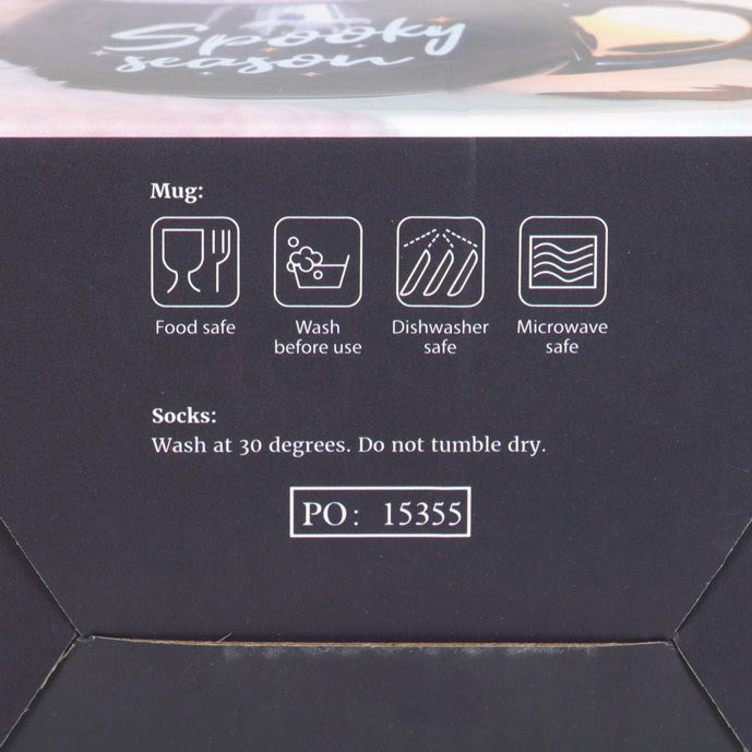 Embrace the 'Spooky Season' with this delightful pastel Halloween set, featuring a rounded purple ceramic mug with the playful phrase 'Spooky Season'. Tucked inside the mug is a pair of cosy, fluffy socks in lilac colour, perfect for keeping feet warm as the autumnal evenings draw near. 500ml capacity. Microwave and dishwasher safe.